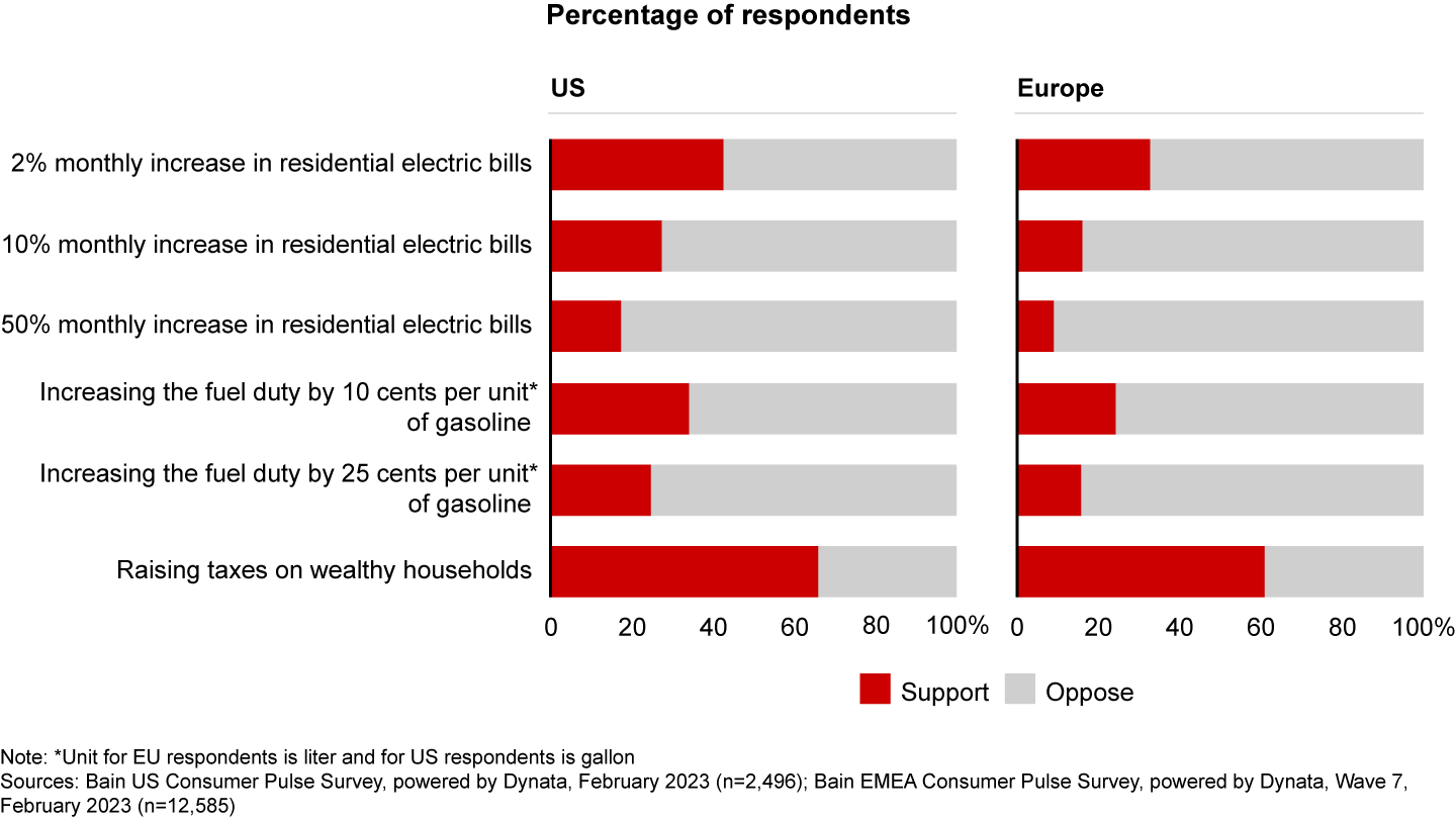 The trouble is that although consumers are concerned about climate change, data suggests that they may not be willing to pay higher bills to help combat it. Recent Bain surveys found that less than half of US and EU consumers are willing to pay even a small increase in their residential electric bill or fuel price to reduce emissions. Instead, they prefer raising taxes on wealthy households, suggesting that consumers believe government should intervene to bring down prices of new technologies (see Figure 3).
