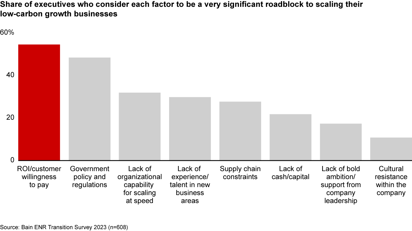 What’s going on? Although the challenges are multifaceted and complex, ENR executives said in our 2023 survey that the most formidable constraint on scaling up low-carbon systems isn’t access to capital or even supply chain challenges—it’s securing sufficient returns on investment and customer willingness to pay higher prices to cover that capital, once deployed (see Figure 1). Put another way, most companies have ample access to capital markets. It’s customer revenue they’re hunting in order to grow these businesses by an order of magnitude in coming years. Until that problem is solved, the $4.6 trillion global investment goal will remain out of reach.