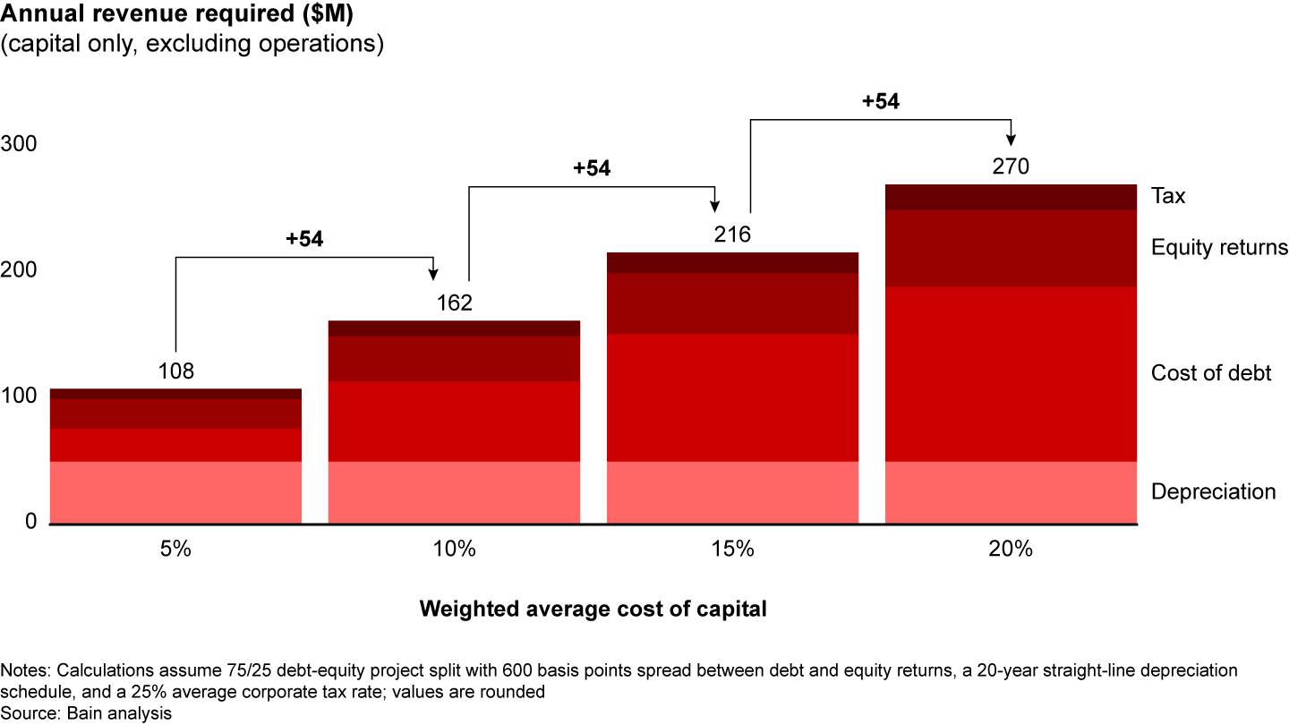 To give a clearer picture of the math surrounding capital formation, a simple rule of thumb is that for every $1 billion in capital invested in a low-carbon project, roughly $60 million in revenue must be collected to cover returns on equity, debt servicing costs, and taxes, assuming a low-risk asset with a 5% cost of capital. That asset must also be depreciated, increasing the revenue required to about $108 million per year, assuming a 20-year useful life. If risk increases, and with it cost of capital, the revenue that must be collected from customers grows further: For every 500 basis points increase in the cost of capital, the annual revenue requirement increases by almost $55 million (see Figure 2). So, as central banks increase interest rates, the effective cost of any given low-carbon project increases as well. At a 10% average cost of capital, every $1 billion in capital deployed requires about $160 million in revenue from customers each year. Furthermore, all of these costs come before operating and fuel expenses.