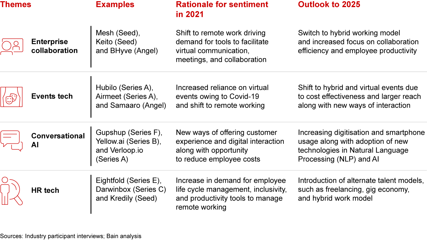 - Horizontal business software: enterprise collaboration, events tech, conversational artificial intelligence (AI), and human resources (HR) tech
