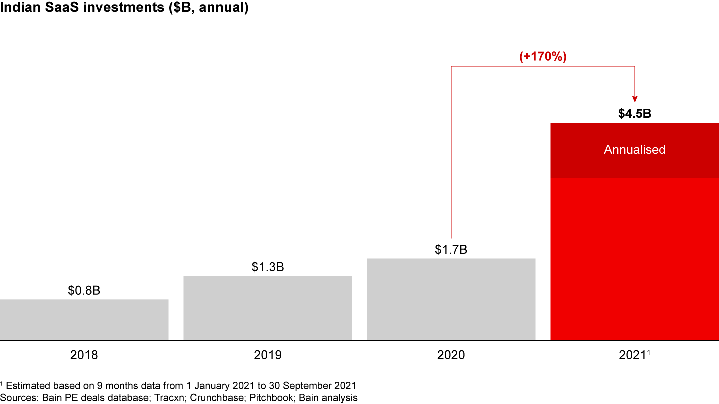 - Investment in Indian SaaS rose to $4.5 billion in 2021, an increase of 170% from 2020, with growth driven primarily by an increase in the number of $50 million-plus deals.