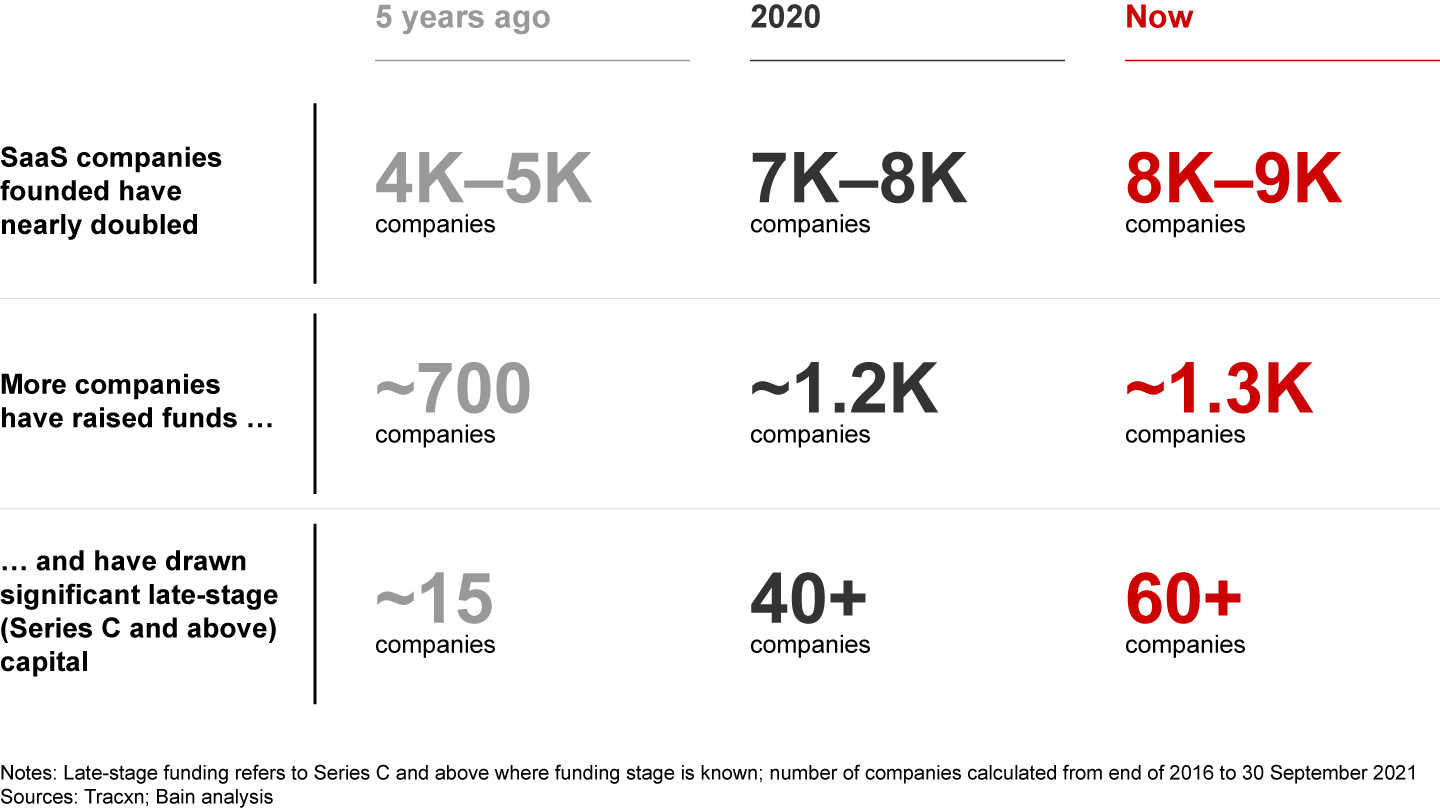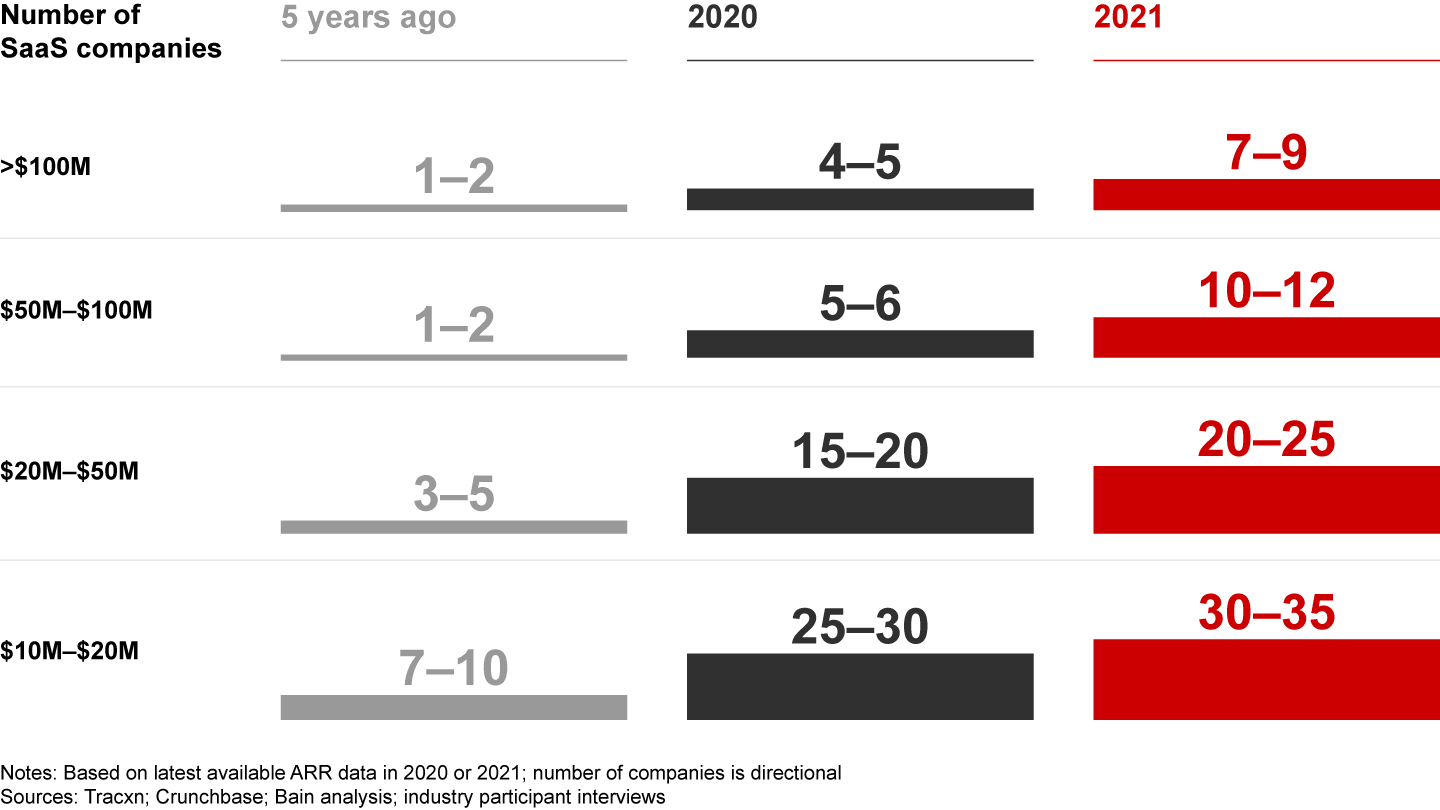 Indian SaaS companies that are maturing and have proven scalability are driving this heightened interest across investment stages. In 2021, more than 35 Indian SaaS companies had $20M+ annual recurring revenue (ARR)—a sevenfold increase over five years—with between seven and nine of these companies reaching the $100M ARR milestone (versus one to two companies five years ago).