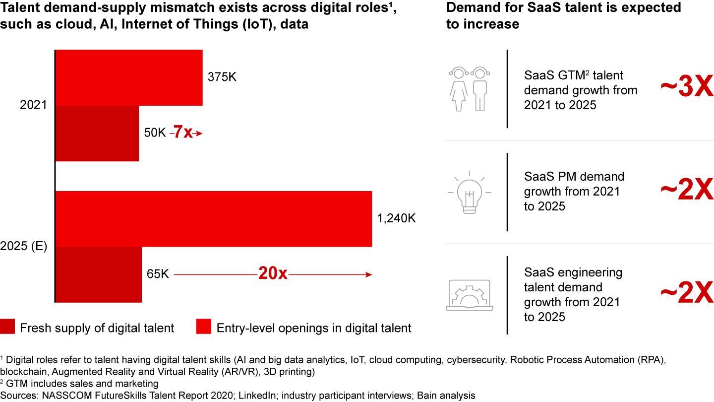 - The talent demand-supply gap is a key constraint for future growth, with SaaS-specific talent demand expected to grow two to three times in the next five years. To bridge this gap, India can increase the supply in two ways: