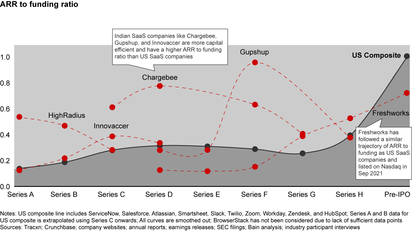 - High capital efficiency: Indian SaaS firms have excellent ARR-to-funding ratios, in line with global SaaS peers, with select Indian companies even outperforming their US counterparts.