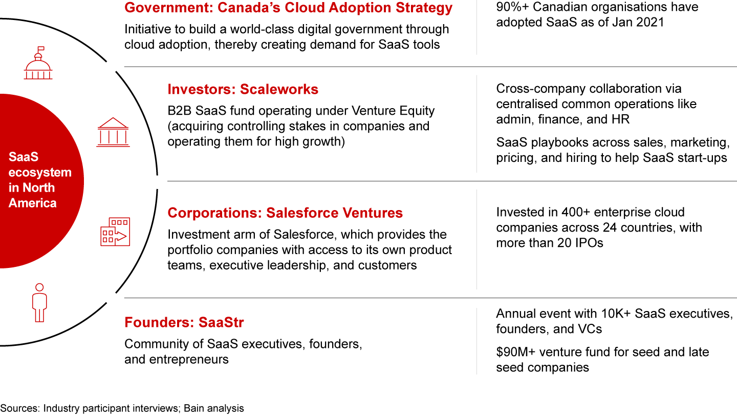 - The US and Canada have spurred SaaS growth through governments generating demand, corporates providing funding, and the industry developing communities for knowledge sharing