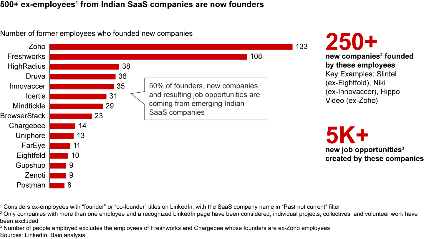 - Cascade effects: More than 250 new Indian firms have been founded by former employees of Indian SaaS companies and now employ more than 5,000 people.