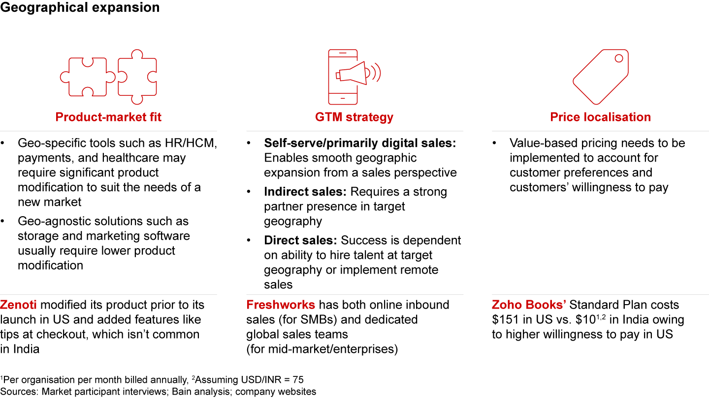 - For geographic expansion, companies should focus on product-market fit and GTM, including price localisation in the target geography