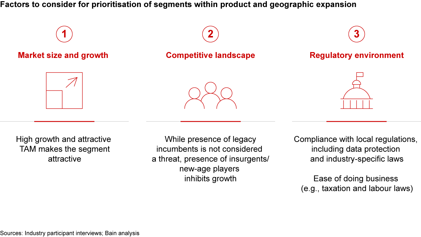 - Product and geographic expansion choices are typically determined by three common factors: market size and growth, the competitive landscape, and the regulatory environment. Companies should consider certain nuances: