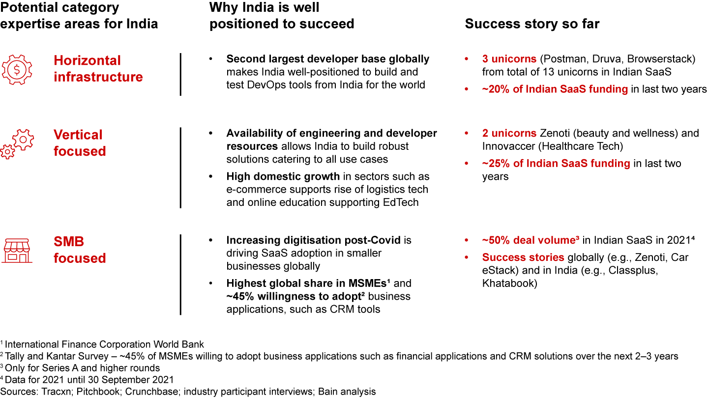 - India has begun to develop pockets of strength in SaaS, specifically in horizontal infrastructure, vertical business, and SMB-focused SaaS. Its position can be further strengthened through ecosystem development, along the lines of other countries’ successful initiatives: