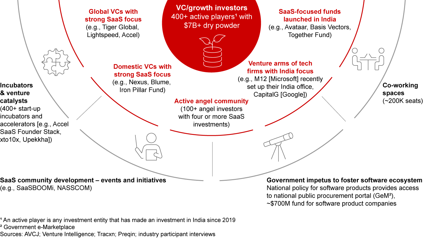 - Specifically, for SaaS, India has a thriving ecosystem comprising 400+ SaaS investors, 500+ incubators and accelerators, and numerous communities and government initiatives to foster the ecosystem.