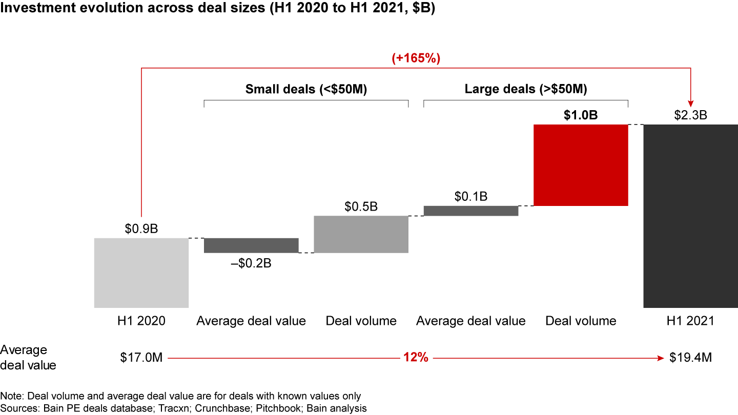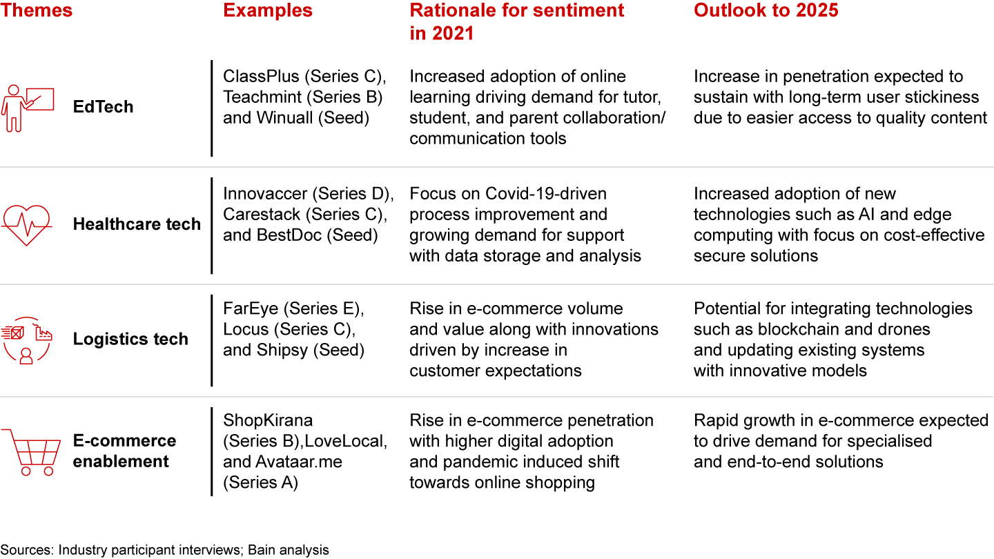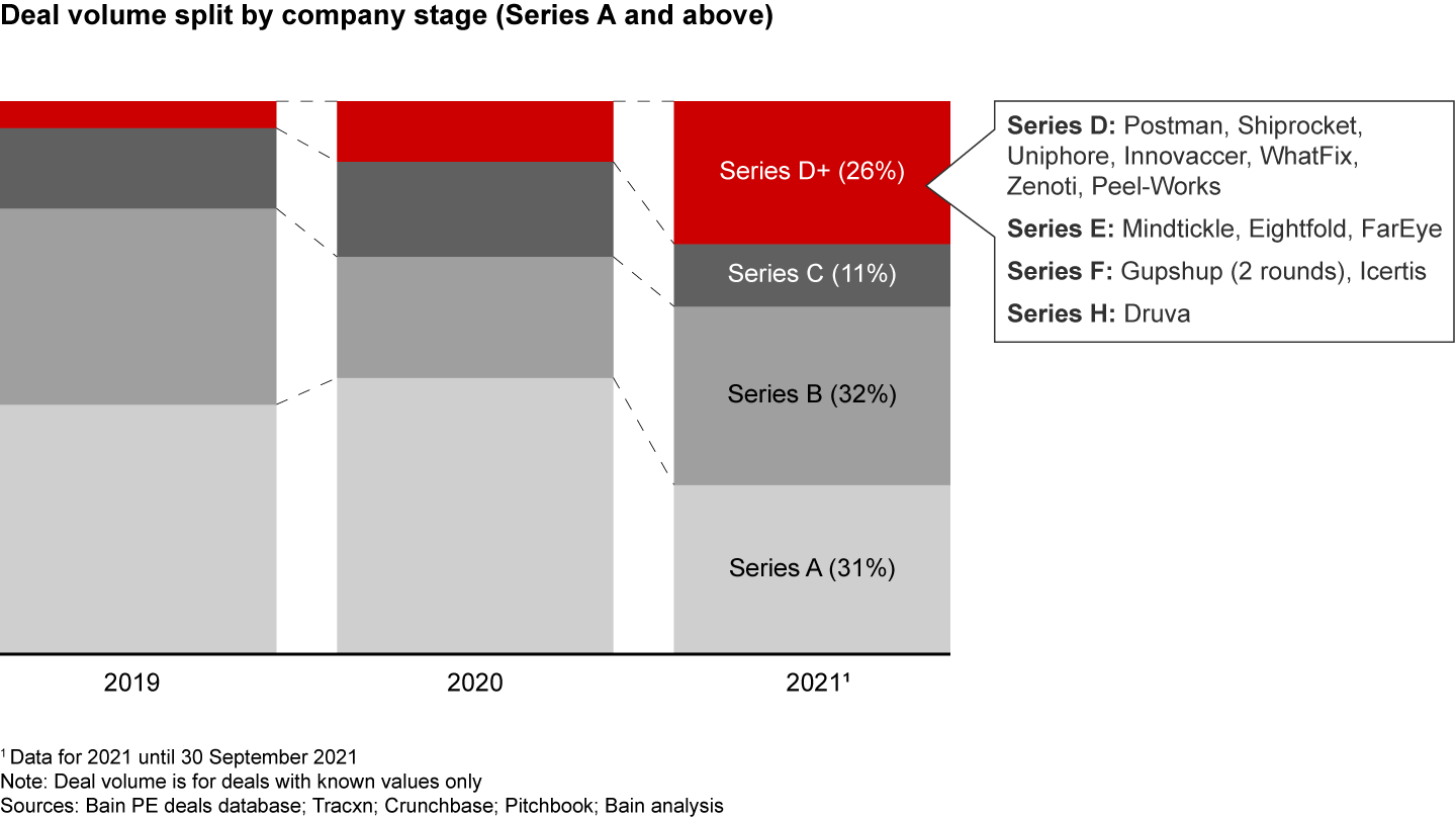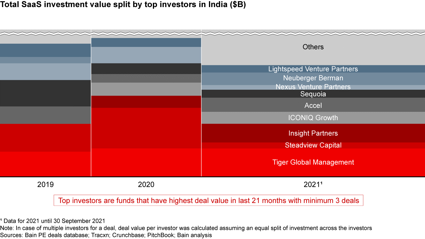 - The top 10 investors’ share in total deal value across 2019–2021 was 30%–35%, with Tiger Global (by value) and Sequoia (by volume) being most active over 2020–2021.