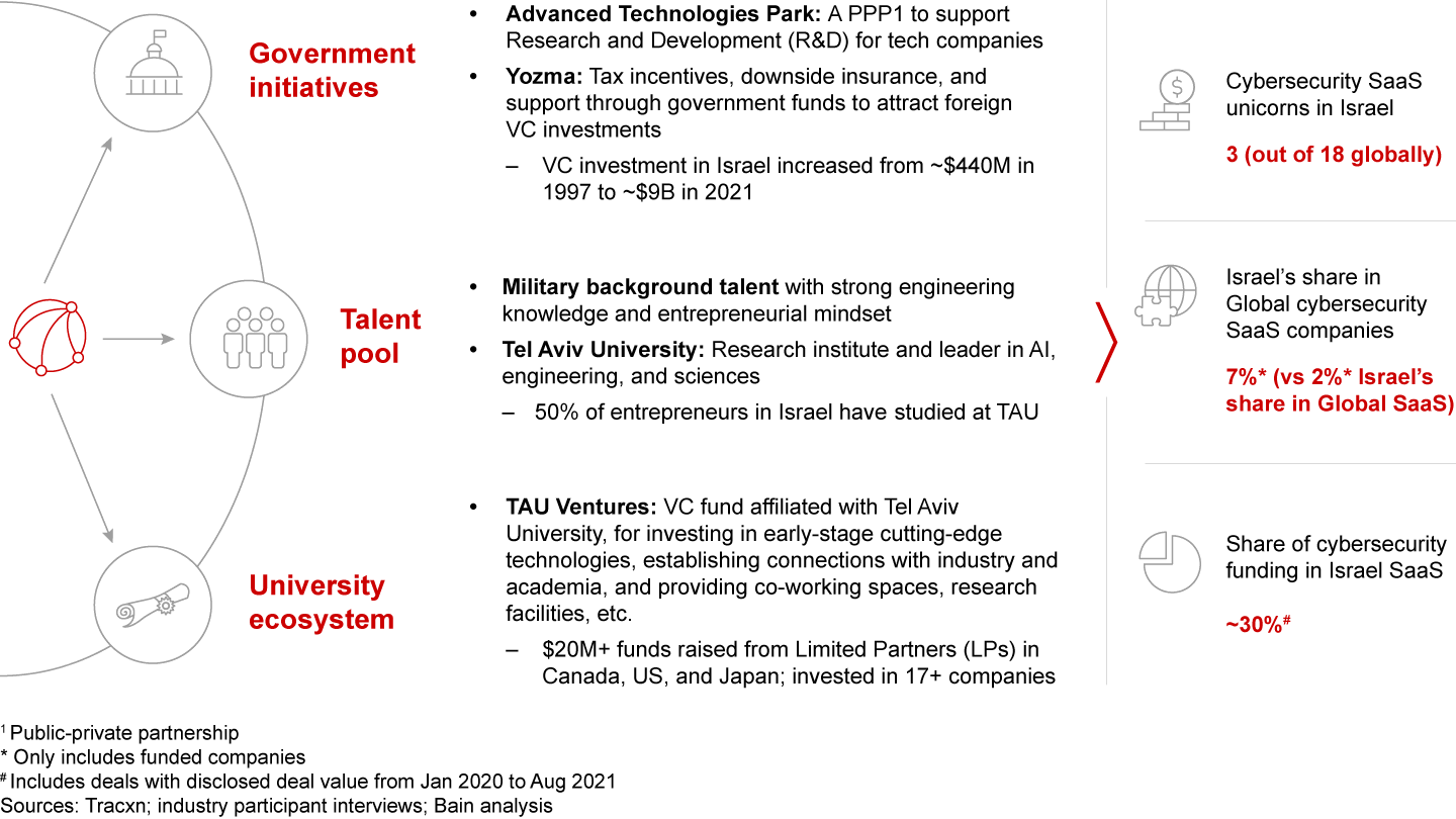 - Israel has successfully developed category expertise in cybersecurity through a strong talent pool with military backgrounds, strong engineering knowledge, and entrepreneurial mindsets, as well as government and university initiatives, including tax incentives and university-affiliated VC funds