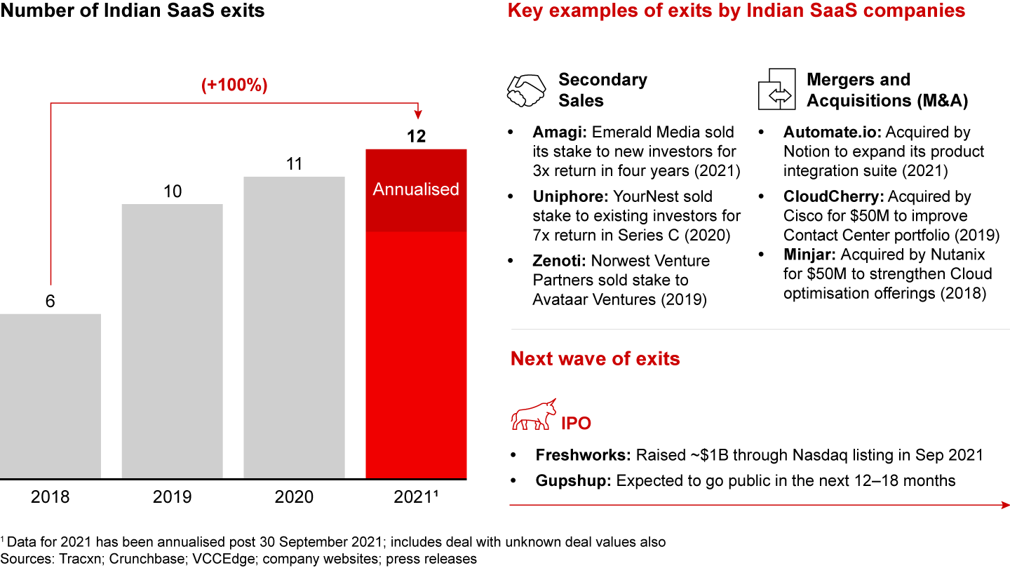 - Growth in exits: The number of Indian SaaS exits increased 100%, from 6 in 2018 to 12 in 2021, with the Freshworks initial public offering (IPO) initiating a new wave of exits.