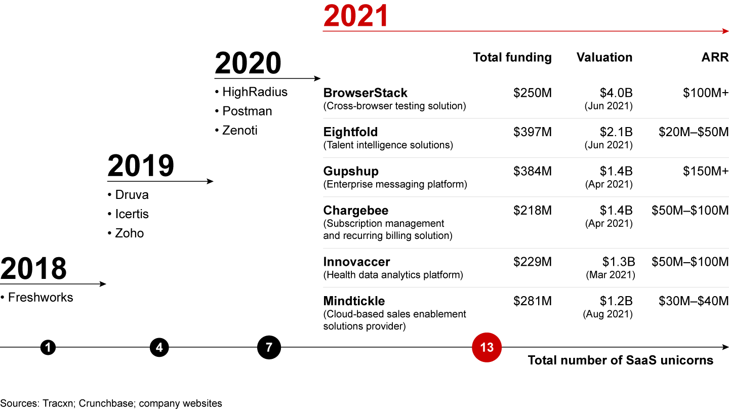 - Increasingly mature companies with demonstrable scale are propelling greater investor interest across both early- and late-stage Indian SaaS companies. India now has 13 SaaS unicorns and seven to nine companies with $100M+ ARR.