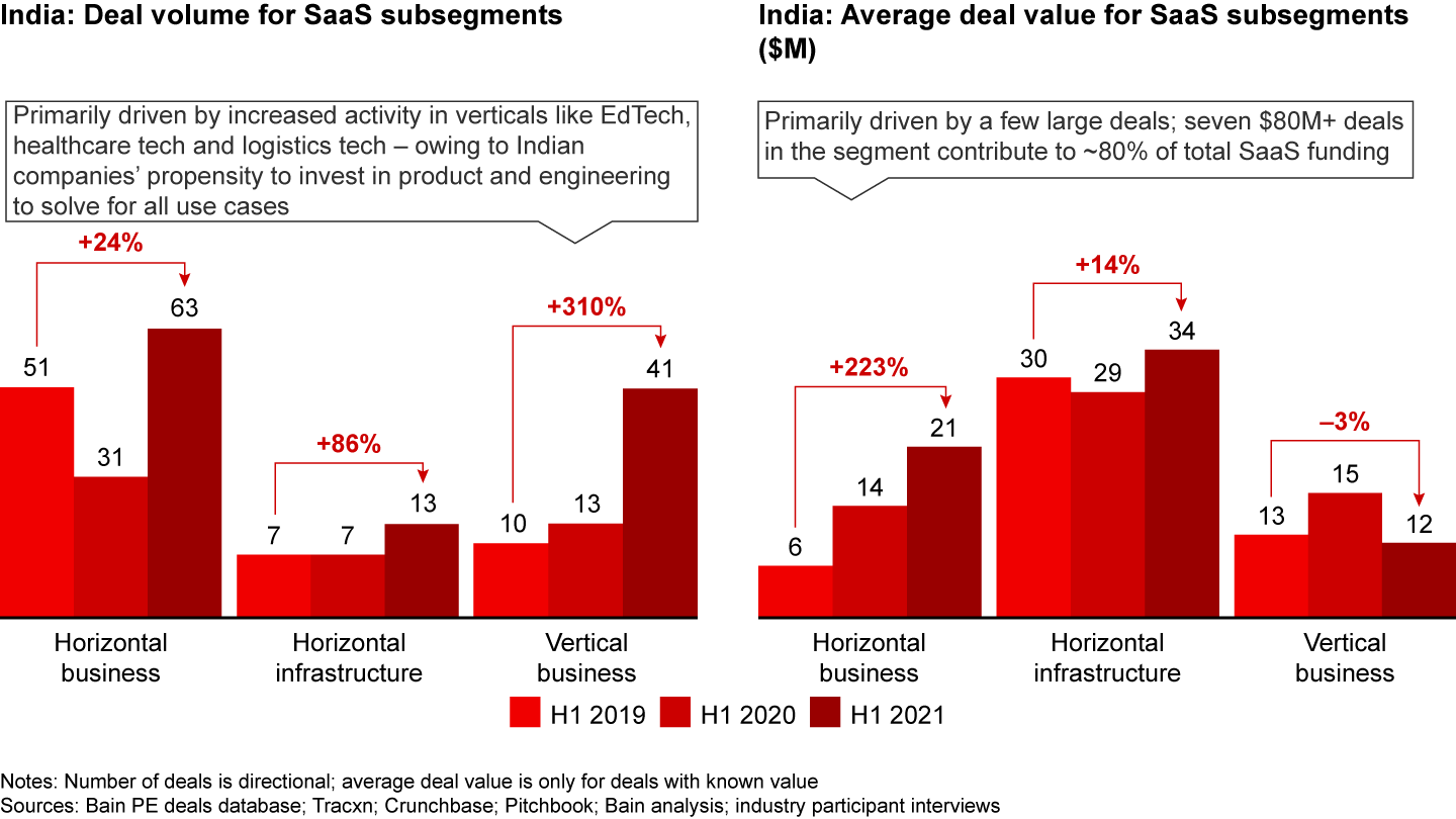 Horizontal business software remains the largest subsegment from an investment standpoint, accounting for more than half of all SaaS funding in India (with vertical business software and horizontal infrastructure software composing the remainder). Vertical business software has seen 100% year-over-year growth, with several Indian success stories emerging. Growth is primarily driven by an increased number of deals for vertical business software and larger deal sizes for horizontal business software.