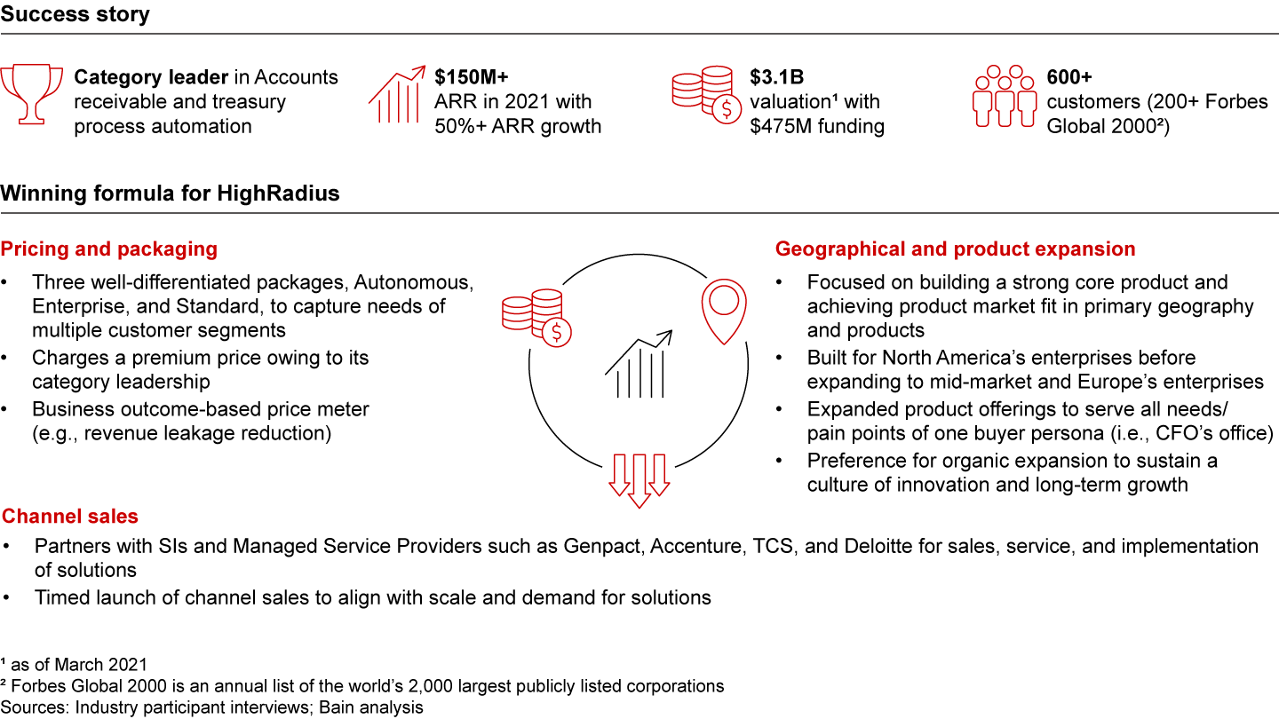 Getting these winning business elements right can deliver tremendous business growth. HighRadius, for example, has exhibited several of these winning characteristics over the course of its journey. Before expansion to Europe and small and medium-sized businesses (SMBs), HighRadius focused on building a strong core product and achieving product market fit for North American enterprises. The company supported this growth through carefully curated packages and an outcome-based price meter. With scale, HighRadius started effectively engaging with channel partners for sales and implementation.