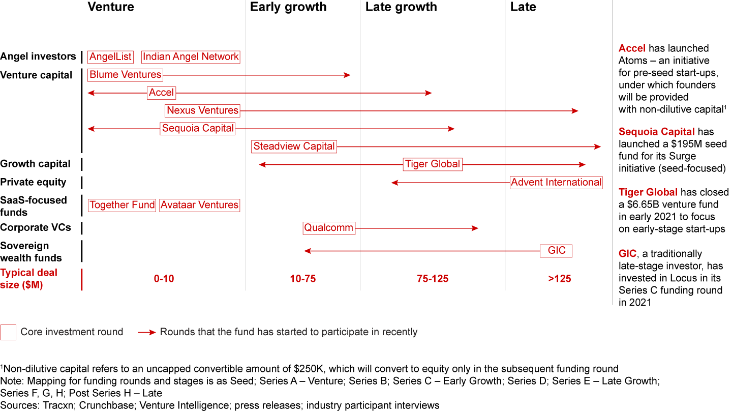 The continued growth in Indian SaaS funding has attracted an increasingly diverse investor base. India has witnessed the emergence of SaaS-focused funds, combined with growing interest from new investor categories, such as corporate venture capital (VC) and sovereign wealth funds. Investors are also increasingly active across investment stages, with traditionally early-stage investors now focusing on growth investments and later-stage investors participating in earlier rounds. As an example, Accel has invested in seed-stage start-ups like Airmeet and Zomentum, as well as Series C+ start-ups like Zinier and Mindtickle.