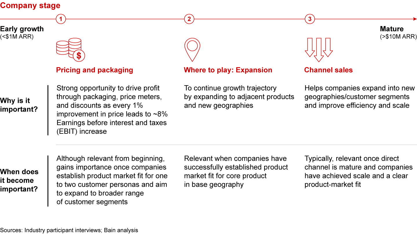 - As SaaS companies grow, they should focus on three key commercial areas: