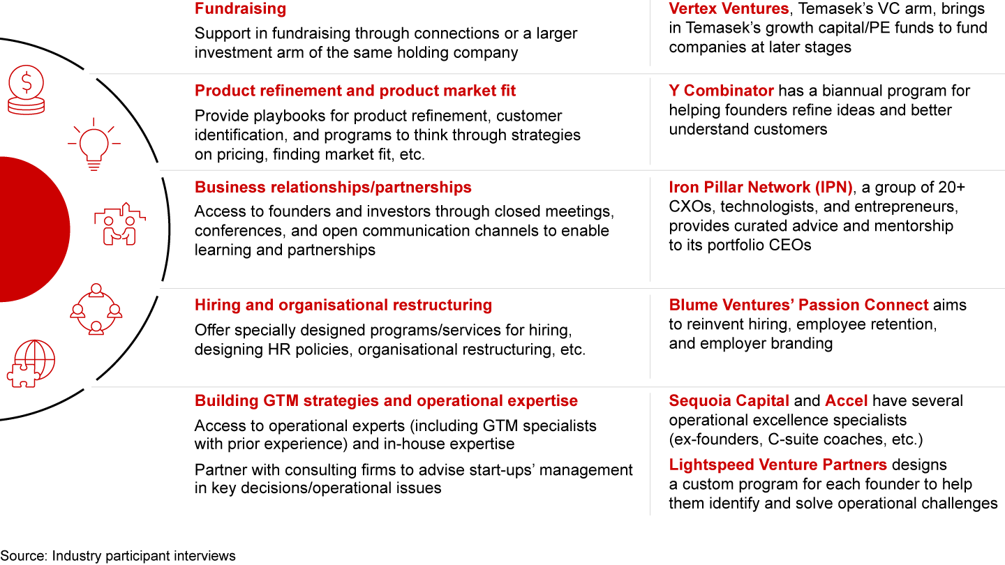- To address rising expectations from founders beyond capital requirements and network, investors now also provide operational and advisory support for GTM, product growth, and recruitment.