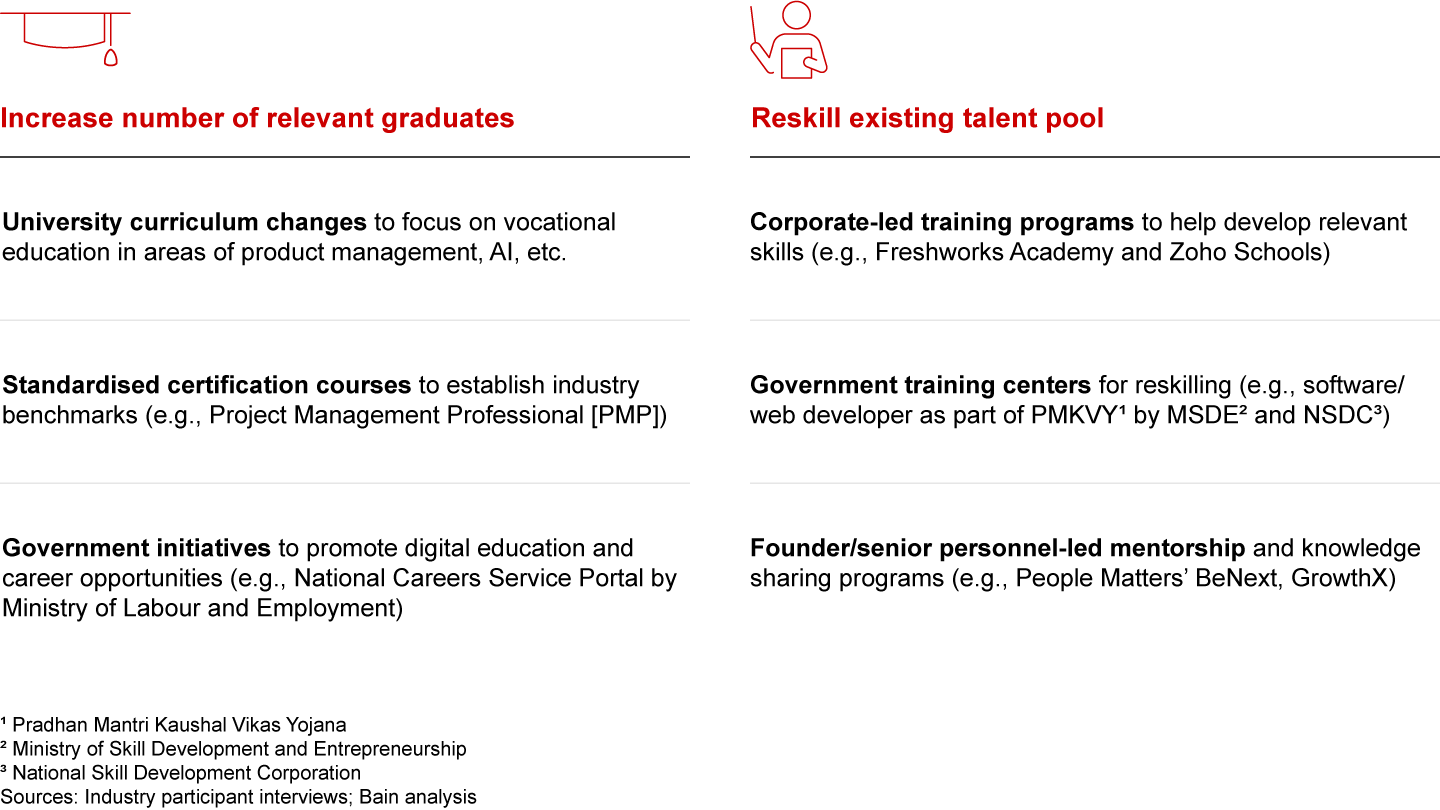 Initiatives that focus on improving talent are especially critical, given that the talent demand-supply gap remains a key issue for Indian SaaS companies. To meet the growing demand for talent, India should focus on increasing the number of graduates with relevant skills while reskilling the existing talent pool to better equip them for an evolving workplace.