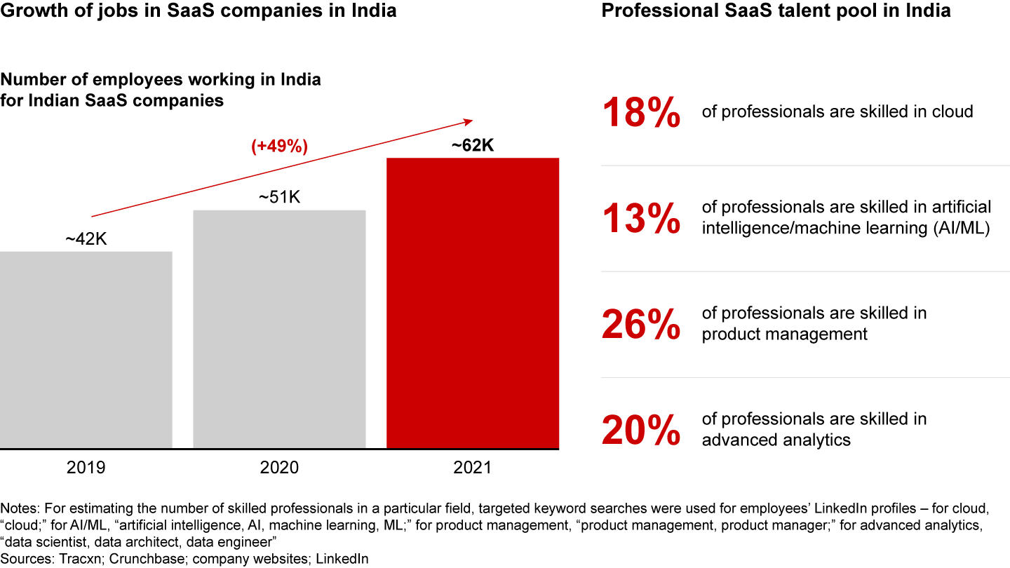 - Creation of talent pools: Indian SaaS companies are building a talent pool of professionals with SaaS-relevant skills and currently employ more than 62,000 people in India.