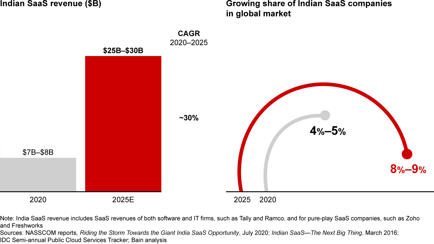 - With an increasing number of world-class founders and strong investor support, Indian SaaS companies are poised to reach $30B in revenue, capturing an 8% to 9% share of the global SaaS market by 2025.