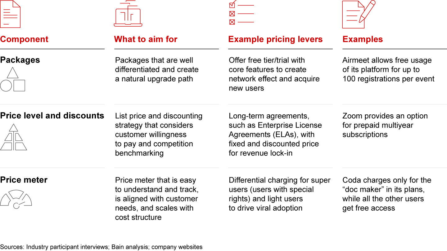 - Pricing and packaging strategy consists of three key components: packages that offer the right coverage across customer segments, pricing levels that establish the correct market positioning, and price meters that drive value as usage grows.